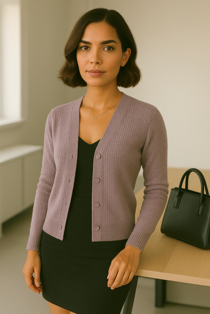Lavender has been around for a bit, but this year it’s more muted—like a dusty, grayish purple that’s way easier to wear than the super bright versions. I picked up a dusty lavender cardigan, and I’ve been throwing it over everything, from jeans and a tee to a little black dress for work. It adds a soft pop of color without screaming for attention, and it looks so good with gray or black pieces. If you’re into nails, this shade also makes a really pretty mani—I tried it last week and got so many questions about it!